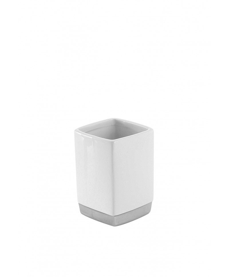 Recipiente de cerámica blanca con base plateada.