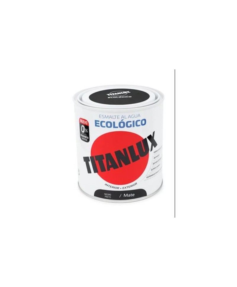 Color negroMate.250 ML. Titanlux esmalte ecológico para interior-exterior. Todas las superficies. No huele. Secado express. Super lavable. Ultraresistente y flexible.0% disolventes alifaticos.